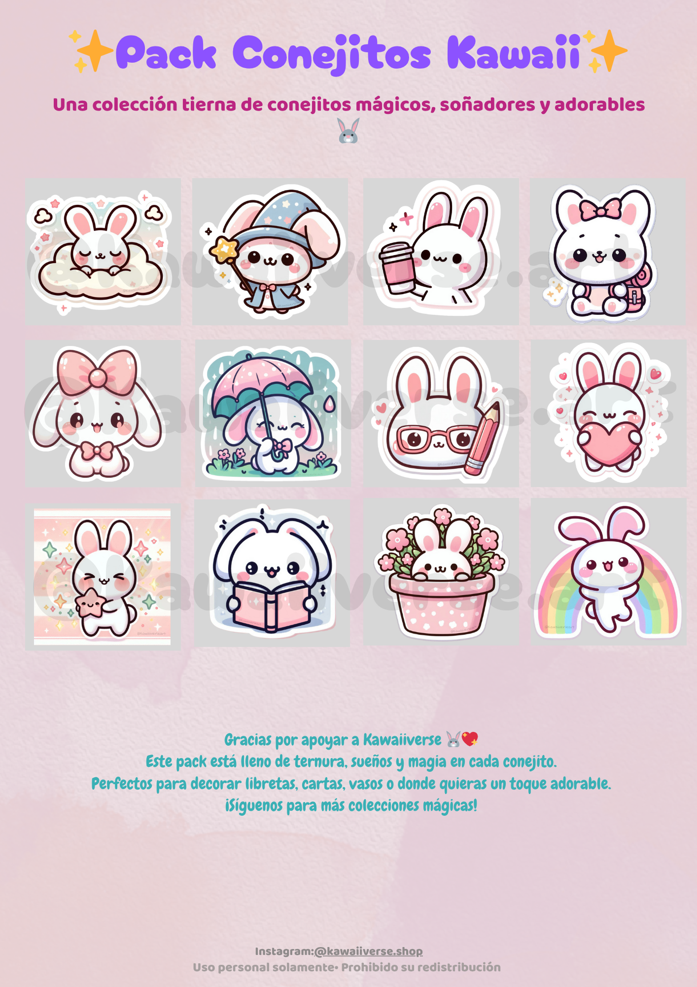 ¡Estos conejitos no son comunes! Saltan entre arcoíris, leen historias encantadas y hasta practican un poco de magia con sus gorros de mago. Cada uno tiene una personalidad única lista para alegrar tus libretas, cartas o creaciones digitales.