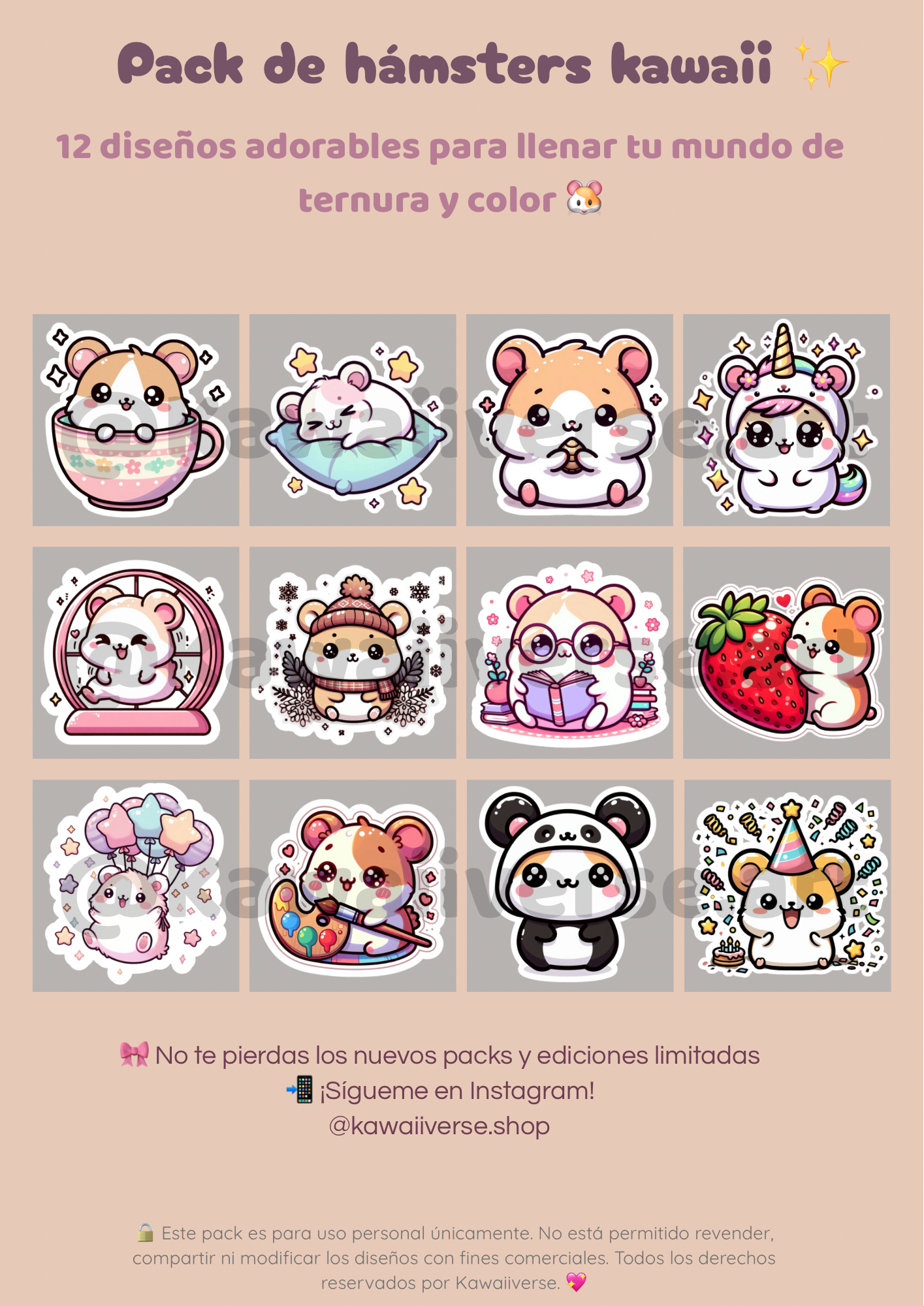 ¡Prepárate para una dosis extra de ternura! Este pack presenta a pequeños hámsters adorables en distintas situaciones súper kawaii. Algunos comen, otros duermen y todos roban sonrisas.